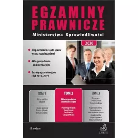 Nowe wydanie zawiera zaktualizowane stany faktyczne oraz prawne, dostosowane do obecnie obowiązujących przepisów prawa. Egzaminy Prawnicze Ministerstwa Sprawiedliwości: stanowią wyjątkowe i kompleksowe rozwiązanie przeznaczone specjalnie dla osób przygotowujących się do egzaminu końcowego na aplikacjach prawniczych, ale i dla aplikantów w trakcie aplikacji i dla praktyków składają się z 3 tomów odpowiadających poszczególnym częściom – dniom egzaminu radcowskiego i adwokackiego: części cywilnej i karnej, gospodarczej i administracyjnej oraz etycznej, zawierają wzory pism z zakresu prawa cywilnego, karnego, gospodarczego i administracyjnego wraz ze szczegółowymi komentarzami, omówieniem najważniejszych podstaw apelacyjnych i kasacyjnych. Tom 2 obejmuje Akta gospodarcze i administracyjne, a w nich: propozycje odpowiedzi do kazusów egzaminacyjnych z lat 2010-2019, zaktualizowane na obecny stan prawny kazusy gospodarcze wraz z propozycjami umów, zaktualizowane na obecny stan prawny kazusy administracyjne wraz z propozycjami skarg i odwołań, mini kazusy wraz z odpowiedziami z prawa administracyjnego, wzór skargi do WSA z omówieniem, kompletne akta spraw gospodarczych wraz z wyrokami i uzasadnieniami w celu sporządzenia apelacji, apelacje, opinie, umowy oraz skargi sporządzone przez praktyków. UWAGA! Treść zadań egzaminacyjnych z lat 2010-2019 znajdziesz na stronie www.egzaminyprawnicze.beck.pl.