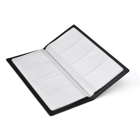 Zawiera koszulki foliowe na cztery wizytówki w pionie umocowane na stałe. W środku 120 miejsc na wizytówki.