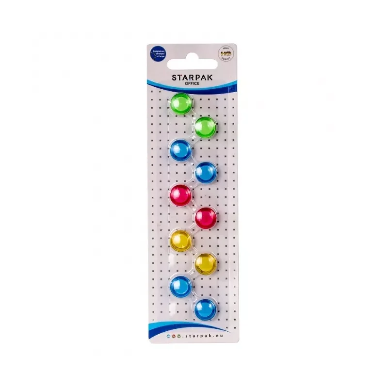 Magnesy transparentne to praktyczny i uniwersalny zestaw dla domu, biura i miejsca pracy. Każdy magnes znajduje się w plastikowej obudowie i występuje w czterech kolorach. Średnica każdego magnesu wynosi 15 mm, a zestaw zawiera 10 sztuk pakowanych na blistrze.