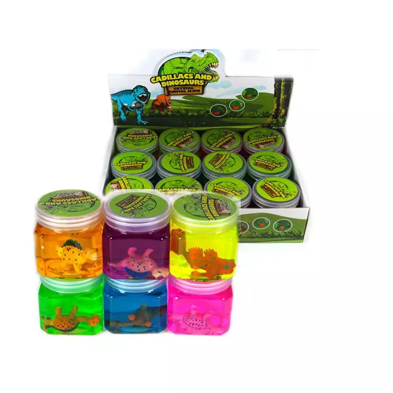 Glut slime z dinozaurem w środku w kolorach neonowych jest przyjemny w dotyku i łatwy w formowaniu, mokry, nie brudzi.