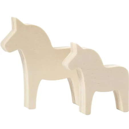 2 stojące koniki ze sklejki w kolorze jasnego drewna. Idealne do pomalowania farbami akrylowymi, ozdobienia techniką decoupage lub obklejenia masami plastycznymi, papierem, włóczką itp. Wielbiciele naturalnego drewna mogą po prostu postawić na półce i cieszyć się ozdobą mieszkania. Nieodpowiednie dla dzieci w wieku poniżej 36 miesięcy.