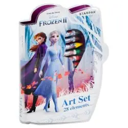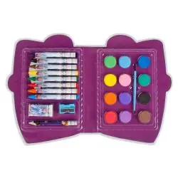 Poręczny zestaw artystyczny, który idealnie mieści się w dziecięcym plecaku. W skład zestawu wchodzi 28 elementów, w tym: 8 kredek woskowych, 12 farb akwarelowych, pędzelek, ołówek, temperówka, gumka do mazania i 4 kolorowanki z ulubionymi bohaterami. Wszystko zapakowane w kolorowe, trwałe pudełko.