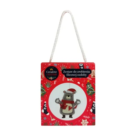 Creative Christmas, Filcowa ozdoba Miś Bryś Zestaw do uszycia własnej filcowej ozdoby. Zestaw zawiera: filcowy materiał, elementy dekoracyjne, wypełnienie, nici, plastikową igłę. Instrukcja: 1. Skompletuj elementy potrzebne do uszycia zawieszki. Nawlecz nitkę na igłę dołączoną do zestawu. Zacznij od wyszycia środkowych elementów. 2. Nawlecz