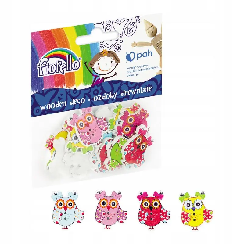 Fiorello ozdoby drewniane – guziki sowa, 15 sztuk to uniwersalny zestaw do scrapbookingu, rękodzieła i dekoracji. Naturalne drewno i atrakcyjny motyw sowy umożliwiają tworzenie wyjątkowych projektów oraz ozdabianie ubrań, torebek i akcesoriów.