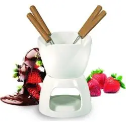 Fondue do czekolady wykonane z ceramiki w kolorze białym z linii Collezione Bianca - Miseczka i podstawka z miejscem na podgrzewacz wykonana z ceramiki. W zestawie są 4 widelczyki z bambusową rączką. Miseczka ma falowany brzeg, przypominając rozkwitniętego tulipana.