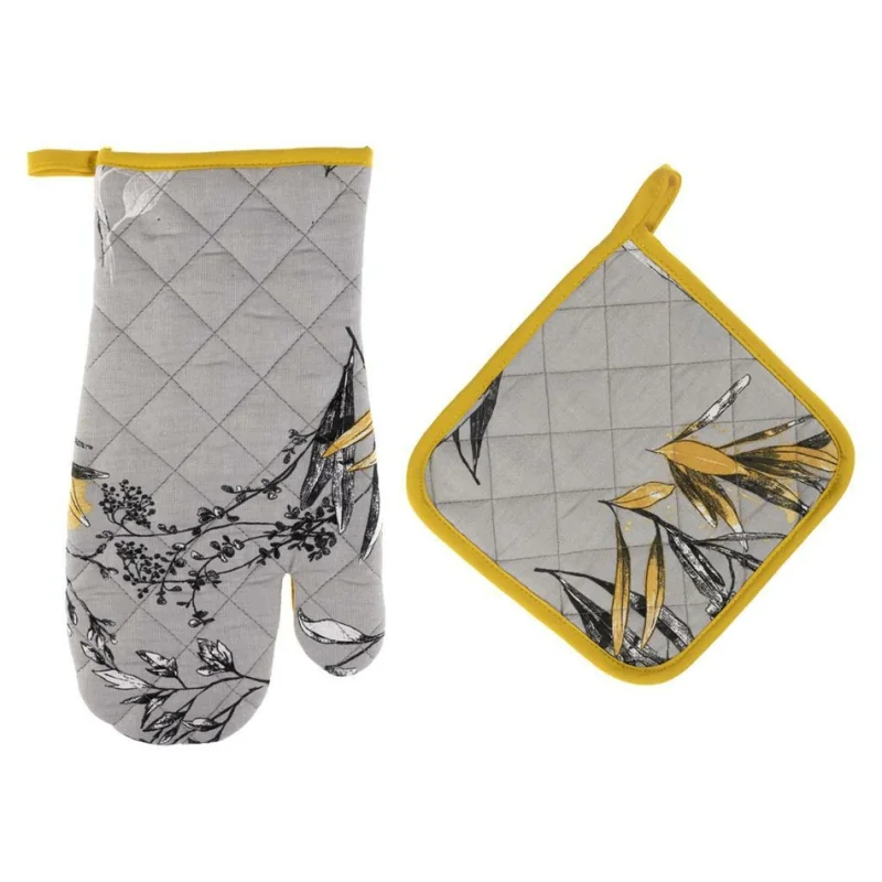 Zestaw rękawicy i łapki kuchennej to niezbędnik w każdej kuchni, zapewniający skuteczną ochronę przed gorącem podczas przenoszenia gorących naczyń, blach czy garnków. Produkt dedykowany osobom ceniącym bezpieczeństwo i komfort pracy przy gotowaniu i pieczeniu. Antypoślizgowa powierzchnia gwarantuje pewny chwyt, a wytrzymały materiał zabezpiecza dłonie przed poparzeniami.