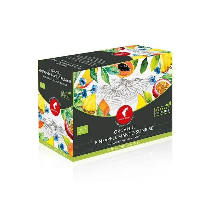 Julius Meinl Green Pineapple Mango Sunrise to w 100% organiczna herbata zielona o wyjątkowo egzotycznym aromacie. Połączenie mango, ananasa, papai i delikatnej nuty bergamotki tworzy napar, który przeniesie Cię myślami w słoneczne