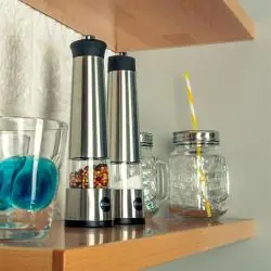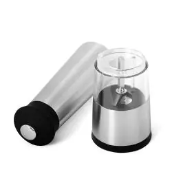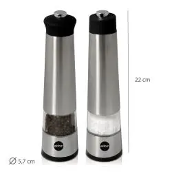 Zasilanie: 8 baterii AAA (po 4 na każdy młynek, brak w zestawie). Korpus: stal nierdzewna, odporna na uszkodzenia i łatwa w czyszczeniu. Żarna: ceramika.