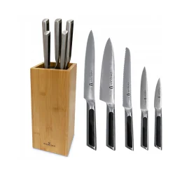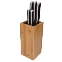 Zestaw noży w bloku Zwieger Klassiker to połączenie funkcjonalności, trwałości i ponadczasowej estetyki. Zestaw został zaprojektowany z myślą o użytkownikach, którzy oczekują precyzji krojenia, wygody codziennego użytkowania oraz spójnego wyglądu kuchni. Prosta, geometryczna forma bambusowego bloku oraz starannie dobrany komplet noży