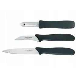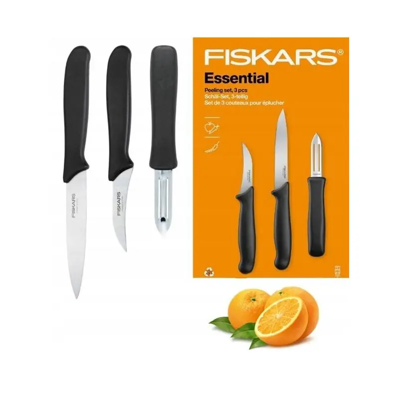 Wybierz zestaw Fiskars Essential, jeśli chcesz mieć pod ręką poręczne noże do obierania i krojenia oraz skrobaczkę, która przyspiesza codzienne przygotowywanie posiłków.