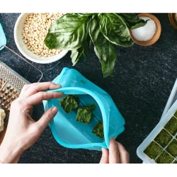 Stasher Stand Up Bag Mega (Aqua) 3L to nowoczesna torba silikonowa wielokrotnego użytku do przechowywania żywności i podróży, która łączy funkcjonalność, trwałość i bezpieczeństwo użytkowania. Wykonana w 100% z platynowego silikonu spożywczego, stanowi doskonałą alternatywę dla jednorazowych opakowań. Dzięki dużej pojemności i konstrukcji 3D idealnie sprawdzi się do przechowywania większych porcji jedzenia, płynów oraz akcesoriów w domu i w podróży.
