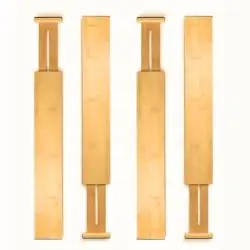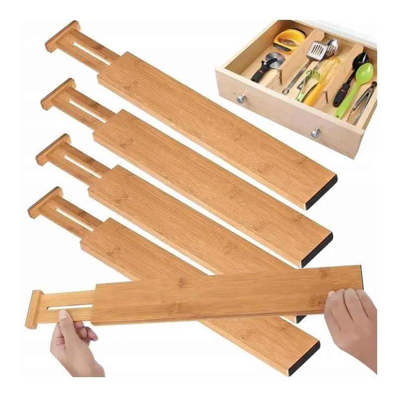 Przegrody do szuflad rozsuwane bambusowe More&Deco 4 szt. to praktyczny i estetyczny organizer do szuflad, który pomaga szybko uporządkować przestrzeń w kuchni, łazience, biurze lub sypialni. Dzięki regulowanej konstrukcji ze sprężynowym mechanizmem przegrody można łatwo dopasować do różnych rozmiarów szuflad, zyskując wygodny podział
