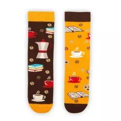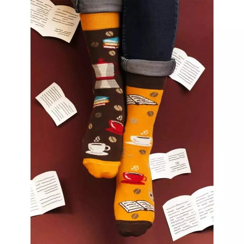Skarpety KSIĄŻKA I KAWA to nieodłączny element stylizacji każdego kawosza i mola książkowego! Czy może być lepsze połączenie niż dobra książka, aromatyczna kawa i pyszne ciastko? Wszystkie te elementy znajdziesz na asymetrycznych skarpetkach, które idealnie sprawdzą się jako prezent dla fana literatury.