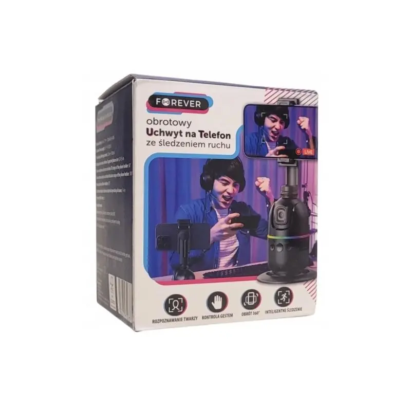 Inteligentny obrotowy uchwyt FOREVER 360° to nowoczesne rozwiązanie do nagrywania, wideorozmów i transmisji na żywo. Dzięki automatycznemu śledzeniu twarzy i sylwetki uchwyt sam dostosowuje kadr do Twojego ruchu, zapewniając pełną swobodę i profesjonalny efekt w każdej sytuacji.