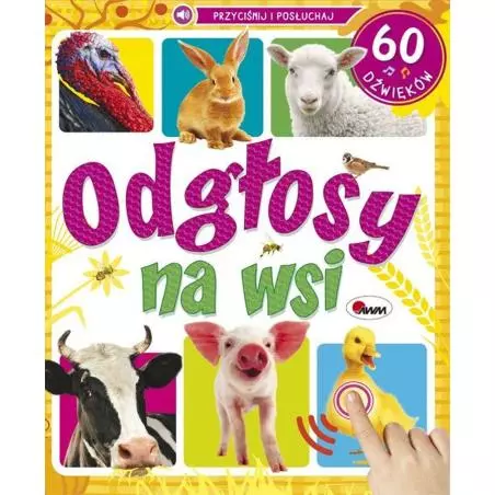 Książka zabiera małych czytelników w niezapomnianą PODRÓŻ NA WIEŚ. Dzieci znajdą w niej proste WIERSZYKI o wiejskich zwierzętach oraz krótkie CIEKAWOSTKI. Wyróżnikiem publikacji jest aż 60 różnorodnych DŹWIĘKÓW. Dzięki niej maluch dowie się, jakie dźwięki wydają krowa, cielę, koń, źrebię, bocian i kombajn. Starannie dobrane ZDJĘCIA charakteryzują się ŻYWĄ KOLORYSTYKĄ.