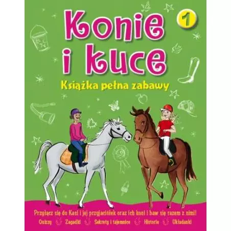 Książka pełna zabawy: KONIE I KUCE to doskonała pozycja dla wszystkich miłośników i miłośniczek koni oraz kuców! Jeśli wiesz, jak osiodłać konia lub co to jest umaszczenie konia i jakie są jego rodzaje - ta książka sprawdzi i poszerzy Twoją wiedzę na te i wiele innych tematów związanych z końmi. A jeśli nie posiadasz jeszcze tej wiedzy ? książka ta dostarczy Ci podstawowych informacji koniach i pomoże zrozumieć ich zachowanie. Książka ta - pełna gier, zabaw, łamigłówek, rebusów, a nawet przepisów kulinarnych i zadań rękodzielniczych - jest pozycją wręcz obowiązkową dla każdego, kto kocha konie i kuce.