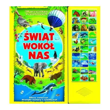 Wspaniała, interaktywna książka edukacyjna! Pokazuje świat zwierząt w ich naturalnym otoczeniu. Dzięki dokładnym ilustracjom i trafnej charakterystyce, dzieci poznają zwierzęta podwórkowe na wsi, w lesie, w dżungli, na sawannie, w górach, na biegunach, w morzach, oceanach i w powietrzu. Dowiedzą się o najciekawszych zjawiskach przyrodniczych. Zaletą książki jest dołączony do niej panel dźwiękowy z 30 różnymi odgłosami zwierząt i efektów naturalnych. Dodatkowo jeden rozdział poświęcony jest współczesnej cywilizacji i intensywnemu życiu miejskiemu.