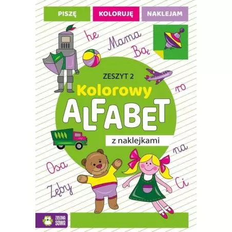 Poznaj alfabet z kolorowymi zwierzakami i mnóstwem naklejek! Pisz, koloruj i baw się! Kolorowy alfabet pozwala dziecku zapoznać się z literami pisanymi w liniaturze. Strzałki w literze wzorcowej wskazują na kolejność łączenia jej poszczególnych elementów. Pisanie po śladzie pomaga utrwalić prawidłowy zapis litery. Książka jest ciekawą propozycją edukacyjną zwłaszcza dla dzieci w wieku 4–5 lat, poznających alfabet i przygotowujących się do samodzielnego czytania i pisania. Proste polecenia pomagają rozwijać koncentrację i spostrzegawczość dziecka. Zamieszczone w książce duże rysunki do kolorowania stwarzają możliwość ćwiczenia sprawności manualnej ręki. Dodatkową atrakcją są kolorowe naklejki zachęcającedo zabawy podczas poznawania liter.