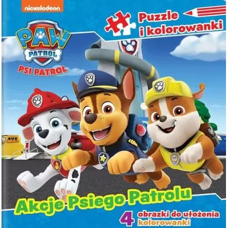 Książka z serii dla przedszkolaków - w twardej błyszczącej oprawie z zaokrąglonymi rogami - zawiera 4 puzzle z dzielnymi pieskami i schowane pod nimi obrazki do pokolorowania. Na każdej stronie znajdziecie ulubione postaci oraz ciekawe informacje o akcjach psiej ekipy.