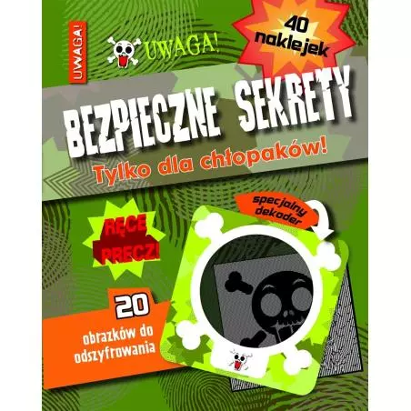 Spisz swoje największe tajemnice i zabezpiecz je dzięki dołączonej do książki kłódce z kluczykiem. Wykonaj tajne zadania i rozwiąż zagadki. Zapisz różne szczegóły dotyczącej Ciebie, twojej rodziny i przyjaciół. Zapamiętaj śmieszne kawały, naucz się technik szpiegowania i poznaj wiele ciekawostek. Użyj dekodera, aby zobaczyć ilustracje przeznaczone tylko dla twoich oczu. Każdy chłopak zachwyci się świetnym notesem zawierającym nie tylko miejsce za sekretne notatki, ale też mnóstwo istotnych dla chłopaków ciekawostek, naklejek i miejsc zawierających zaszyfrowane informacje, które można odczytać tylko dzięki załączonemu do książki dekoderowi! Sekretne notatki zabezpieczy przed wścibskimi specjalna kłódeczka!