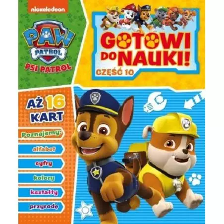 Każda część książki zawiera zadania i karty, które się uzupełniają i stanowią komplet do nauki i zabawy! Stałe miejsce w książce (po 4 strony) mają działy wprowadzające alfabet (32 litery) oraz liczby (od 1 do 20). W zależności od tematyki książki pojawiają się działy: Kolory, Kształty i figury, Przyroda. Pieski z Psiego Patrolu, ulubieni bohaterowie przedszkolaków, zachęcają dzieci do ćwiczeń manualnych (szlaczki, wzory), ćwiczenia spostrzegawczości (szukanie różnic), pisania i czytania liter, liczenia w zakresie od 1 do 20. Na końcu książki pojawia się zabawa, łącząca właśnie poznane przez dziecko tematy edukacyjne. W każdym zestawie 16 kart znajduje się 6 kart edukacyjnych, które mają odniesienia do zadań w książce: 2 karty z literami i przynajmniej 1 karta z cyfrą. Pozostałe karty edukacyjne są związane z tematyką danej książki. Kolejnych 12-13 kart jest potrzebnych do różnorakich gier (Piotruś, memo, szukanie par, domino, gra zegarowa) oraz ułożenia obrazka po zebraniu wszystkich 16 części kolekcji.