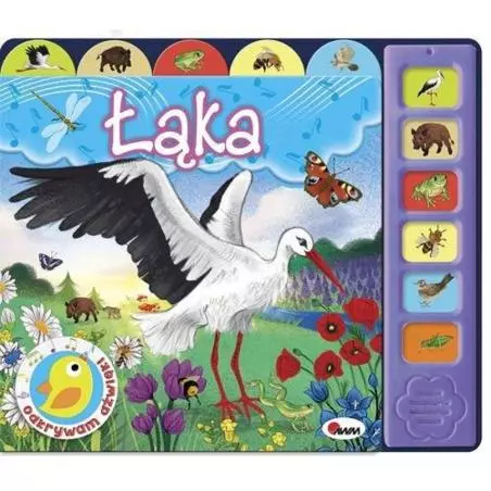 Do każdej historyjki jest dopasowany PRZYCISK DŹWIĘKOWY. Po jego naciśnięciu maluszek usłyszy . Atutem książki są również KOLOROWE WYPUSTKI z obrazkami przedstawiającymi zwierzęta. Dzięki nim można łatwo otworzyć książkę na wybranym dźwięku.