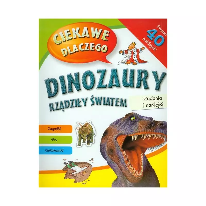 Na stronach tej książki znajdziesz rozmaite ciekawostki na temat dinozaurów, zabawne zgadywanki, zajmującą grę przygodową oraz mnóstwo naklejek. Stwórz własne naklejkowe muzeum dinozaurów, wsiądź w wehikuł czasu, by się przekonać, czy zdołasz przetrwać w prahistorycznym świecie! Tytuły w serii: Ciekawe dlaczego zwierzęta zadziwiają, Ciekawe dlaczego dinozaury rządziły światem.