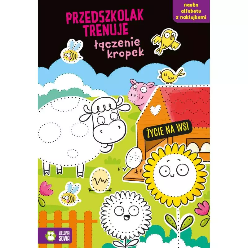 Na wsi jest mnóstwo frajdy! Połącz wszystkie kropki i sprawdź, jakie elementy kryją się na obrazku. Ile łat ma krowa? Jakie kwiaty rosną na łące? Baw się i ćwicz motorykę ręki razem z wiejskimi zwierzątkami! W środku znajdziesz też elementy do pokolorowania.