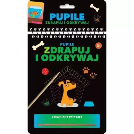 Wykorzystaj drewniany patyczek dołączony do książki i zrób bazgrołkowe wzorki, linie i szlaczki oraz zdrap czarny kolor.