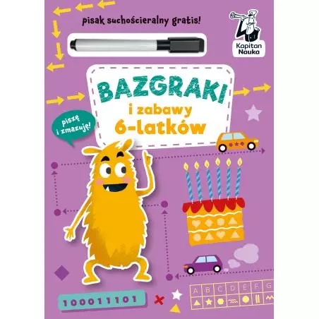 Bazgraki i zabawy dla 6-latków to rozwijające zagadki, dzięki którym przedszkolaki trenują myślenie logiczne, poznają litery i cyfry, tworzą kody i sekwencje oraz ćwiczą rękę, rysując szlaczki, lustrzane odbicia przedmiotów oraz zamalowując pola zgodnie z instrukcją.