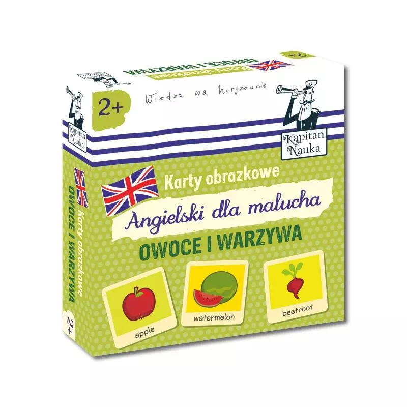 Na 17 trwałych, usztywnionych kartach zamieszczono kolorowe rysunki warzyw i owoców z podpisami po angielsku (awers) i powtórzonym dużym podpisem (rewers). Karty są doskonałym wstępem do wczesnej edukacji. Ich konstrukcja oparta jest na metodzie globalnego czytania, opracowanej przez Glenna Domana, wg której skutecznie uczyć mogą się dzieci w każdym wieku, bez poczucia, że wykonują żmudne ćwiczenia. Ponadto zabawa z kartami znakomicie wspomaga rozwój mowy, rozbudza w dziecku ciekawość świata i stymuluje pracę jego mózgu.