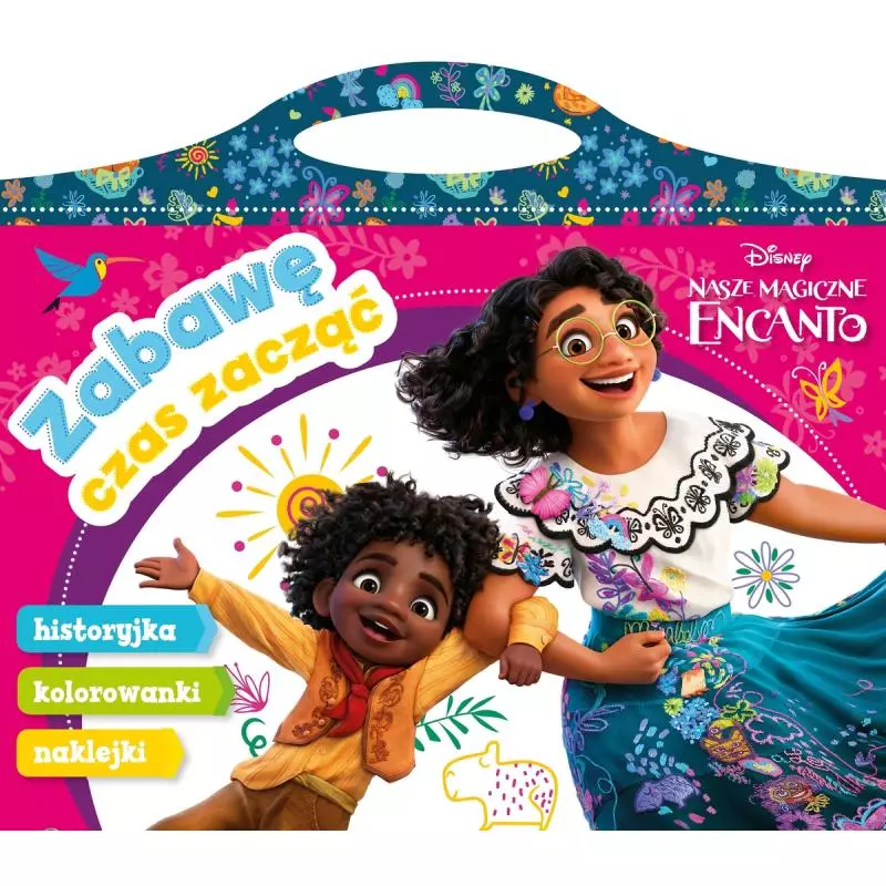 Trzy w jednym, czyli teczka „Zabawę czas zacząć”, w której mały czytelnik znajdzie: historyjkę „Tajemnica w sercu dżungli” z Antonim i Mirabel Madrigal w rolach głównych, kolorowanki z ulubionymi postaciami oraz arkusze z naklejkami z ilustracjami z książki, ale nie tylko. W „Tajemnica w sercu dżungli” dowiemy się, dlaczego żyzne pola, sady i ogrody Encanto usychają i więdną. Rodzina Madrigalów chciałaby zapobiec katastrofie, która zbliża się do ich miasteczka. Mały Antonio postanawia wykorzystać swój dar. Z pomocą papugi, kolibra, wiewiórki, kapibary oraz innych zwierząt odkrywa tajemnicę skrytą w samym sercu dżungli.