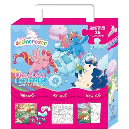 Oto pudełko pełne zabawy z Jednorożcami! Wewnątrz znajdziesz książeczkę z malowankami oraz dwustronne puzzle. Ułóż obrazek z magicznymi stworzeniami, a potem odwróć układankę i pokoloruj scenkę według własnego pomysłu.