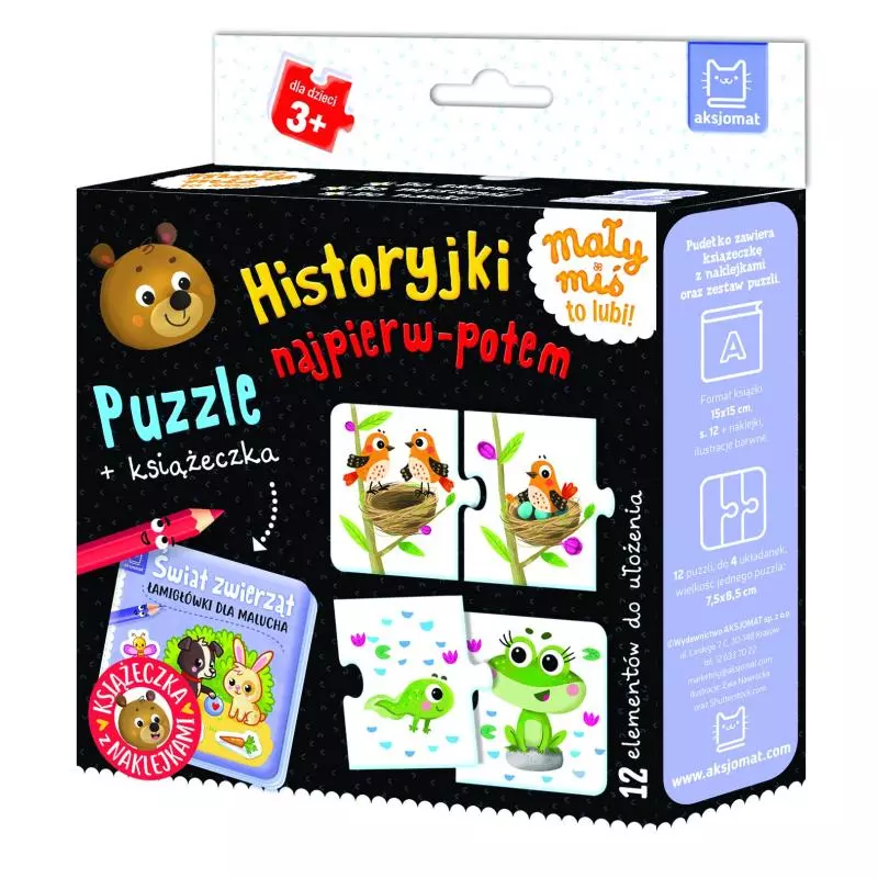 Puzzle służą do ułożenia 4 historyjek. Fragmenty połączone w odpowiedniej kolejności pokazują etapy rozwoju motyla, żaby, piskląt i wzrostu wiśni. Zabawa polega na skojarzeniu pasujących do siebie fragmentów i ułożeniu ich w odpowiedniej kolejności. W książeczce znajdują się łamigłówki oraz zadania rysunkowe z wykorzystaniem dołączonych do książki barwnych naklejek. Dla dzieci powyżej 3. roku życia.