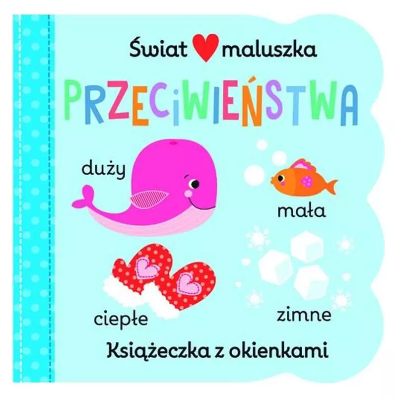 Książeczka dla najmłodszych dzieci z okienkami oraz prostymi ilustracjami uczy i bawi – pozwala poznać przeciwieństwa, rozwija koordynację wzrokowo-ruchową i zachęca do nauki mowy. W serii także: Pierwsze słowa, Zwierzątka, Jeździ, lata, pływa, Kolory, Święta