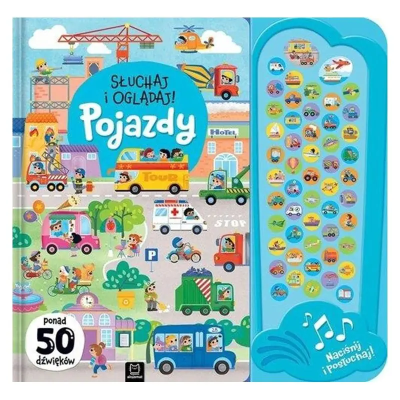 Z tą książką nie można się nudzić! Pięć bogato ilustrowanych rozkładówek z ciekawymi pojazdami w pięciu różnych miejscach: w mieście, na wsi, na budowie, nad morzem i w powietrzu. Oglądaj ilustracje, a potem odpowiadaj na zadane pytania, szukaj wskazanych pojazdów, a przede wszystkim słuchaj ponad 50. odgłosów. Kolor zakładki pomoże ci