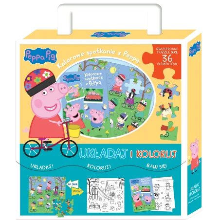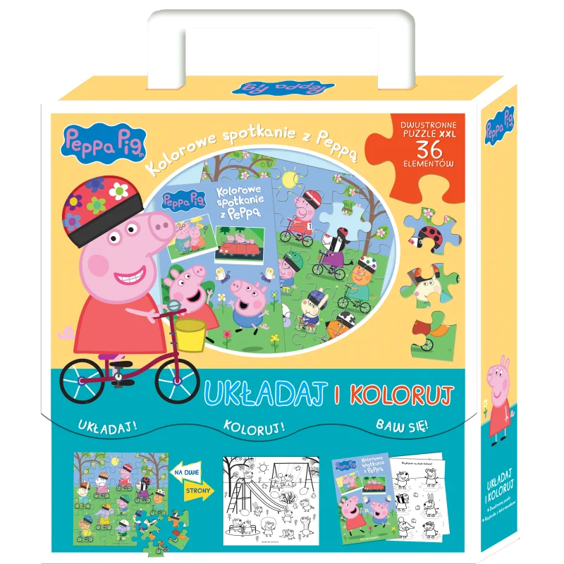 Oto pudełko pełne zabawy ze świnką Peppą! Wewnątrz znajdziesz książeczkę z malowankami oraz dwustronne puzzle. Ułóż obrazek z bohaterami bajki Peppa Pig, a potem odwróć układankę i pokoloruj scenkę według własnego pomysłu.