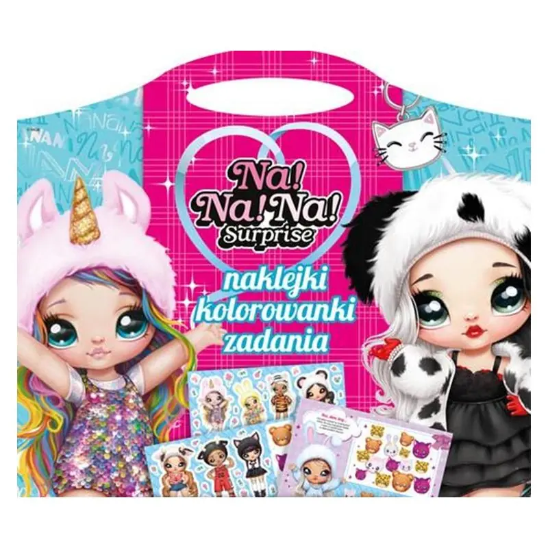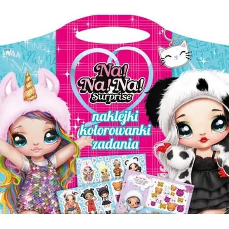 Bajeczna teczka, którą zabierzesz ze sobą wszędzie. Tekturowa teczka z rączką, w której kryje się wiele niespodzianek. W środku znajdziesz 2 karty pełne naklejek, 12 obrazków do pokolorowania oraz – co najważniejsze – książkę z zadaniami osadzonymi w świecie laleczek Na! Na! Na! Surprise.