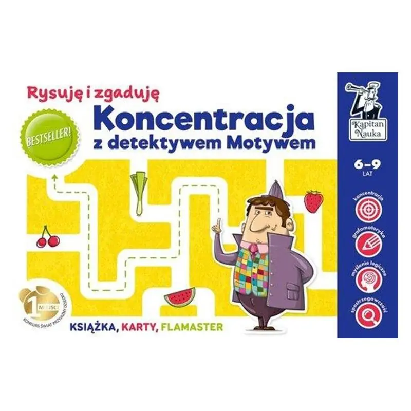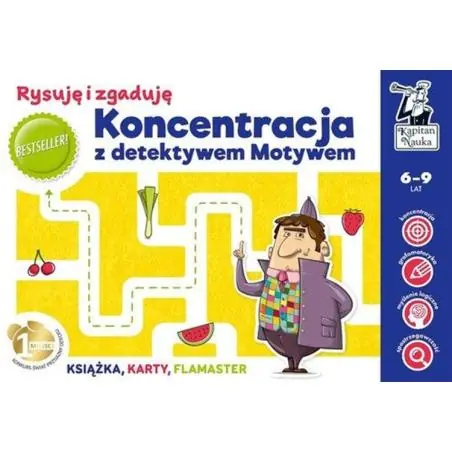 Koncentracja z detektywem Motywem z serii Rysuję i zgaduję to pakiet 100 rozwijających zadań w książce i na zmywalnych kartach. W zestawie również suchościeralny flamaster, dzięki któremu trwa niekończąca się zabawa, a zadania można rozwiązywać wielokrotnie, a także wymieniać się i sprawdzać z rodzeństwem i rówieśnikami. Koncentracja z detektywem Motywem to zestaw zadań przygotowanych przez psycholog Agnieszkę Bielę, która zadbała o ich różnorodność, a także możliwość rozwoju wielu umiejętności: koncentracji, spostrzegawczości i pamięci. W książce znalazły się dodatkowe wskazówki dla rodziców, o tym jak wspierać koncentrację dzieci w wieku szkolnym i wspomagać proces uczenia się nowych umiejętności.