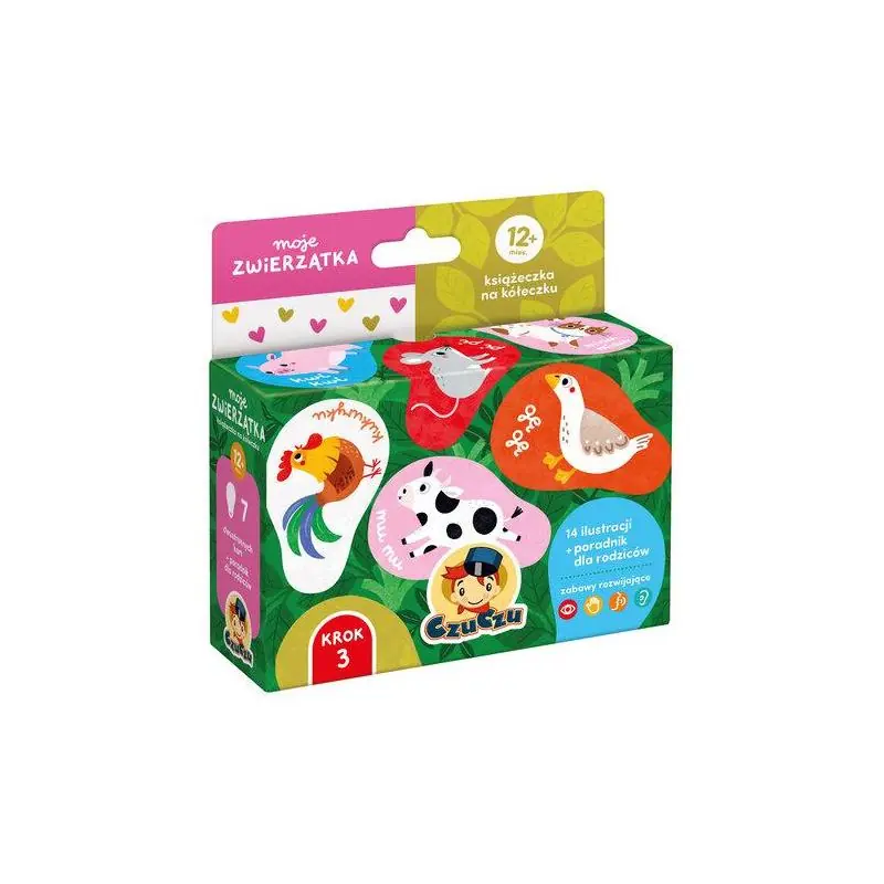 Książeczka obrazkowa dla najmłodszych to 7 sztywnych kart o kształcie dopasowanym do małych rączek, spiętych praktycznym kółeczkiem.Urocze ilustracje przedstawiają sympatyczne zwierzaki i inspirują do mnóstwa rozwijających zabaw: oglądania, pokazywania, nazywania i naśladowania odgłosów i ruchów. To doskonały pomysł na prezent dla roczniaków. Do książeczki dołączono poradnik pełen pomysłów na wspólne zabawy. zestaw zawiera: książeczkę na sznureczku i scenariusze zabaw wymiary pudełka: 14,5 x 14,7 x 5 cm odpowiednia dla dzieci w wieku 12 mies.+ pomysł na mądry prezent sprawdzi się jako pierwsza książeczka obrazkowa