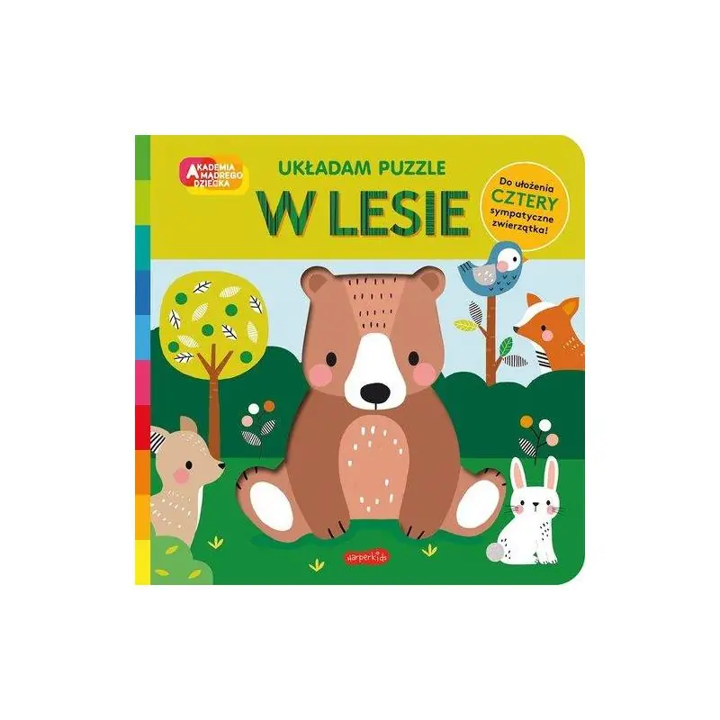 Układam Puzzle Akademii Mądrego Dziecka to nowa seria kartonowych książeczek, które zachęcają do czytania i wspólnej zabawy. Najnowszy tytuł: W lesie przedstawia zwierzęta, które są znanymi wszystkim mieszkańcami lasu. Poznajemy zatem: niedźwiadka, lisa, jelenia i zająca. Każde z tych zwierzątek występuje jako puzzel składający się z