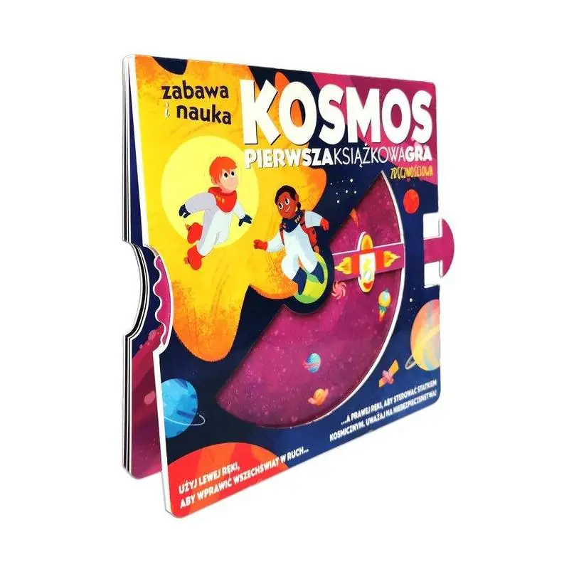 Integralną częścią tej wyjątkowej książki jest umieszczona w okładce gra zręcznościowa, w której dziecko kieruje statkiem kosmicznym i jednocześnie pomaga astronautom unikać zderzenia z planetami i kometami! Ta zabawa świetnie wpływa na rozwój motoryki, koordynacji i spostrzegawczości gracza. Na kolejnych stronach młody czytelnik będzie