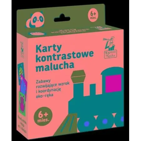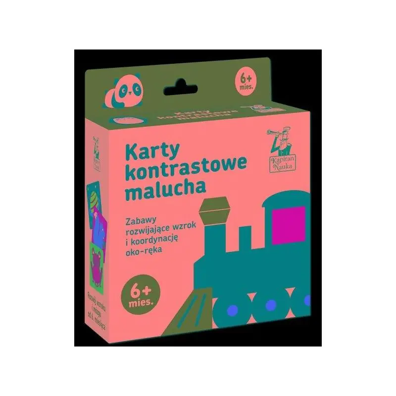 Karty kontrastowe malucha (6+ mies.) to trzeci z serii kontrastowej zestaw zabaw stymulujących wzrok dzieci od 6. do 12. miesiąca życia. Zawiera 12 dużych, dwustronnych wielobarwnych kart łączących 6 kolorów: czarny, biały, czerwony, żółty, zielony i niebieski w kreatywnych zestawieniach. Do pakietu dołączony jest również poradnik dla