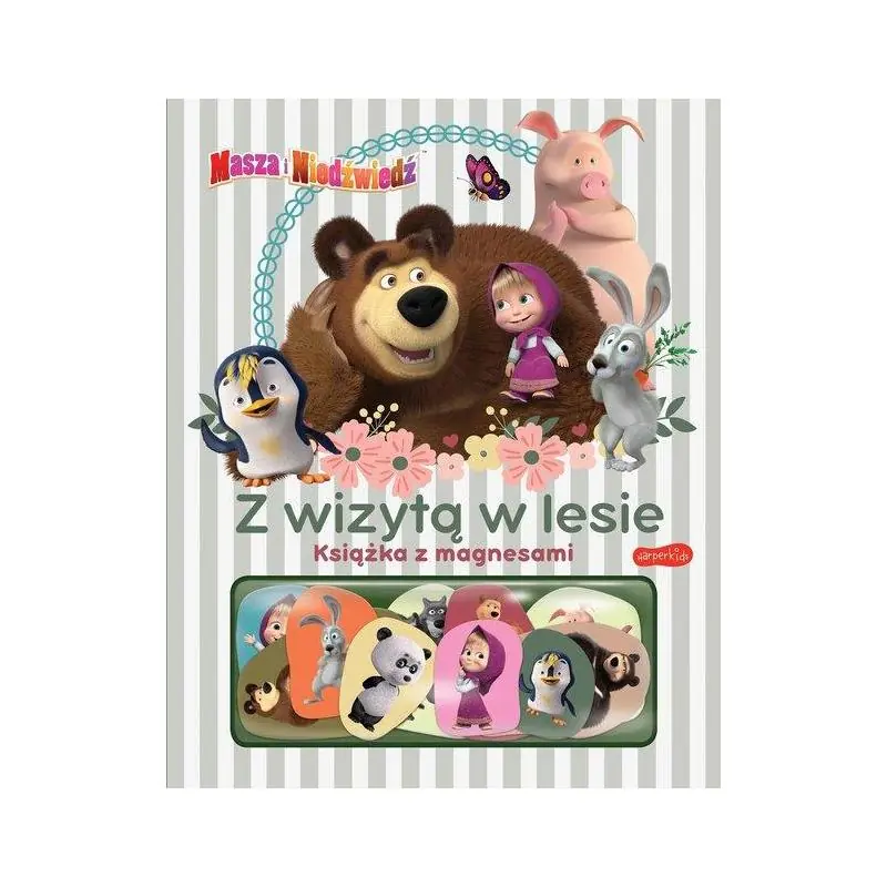 Wpadnij z wizytą do świata, w którym mieszkają bohaterowie twojej ulubionej kreskówki! Na każdej stronie tej książki czekają znane z serialu Masza i Niedźwiedź miejsca. Przytulny i pełen bibelotów dom misia, uroczy pokój Maszy, polana zamieszkała przez wiecznie głodne Wilki i zielony las zapraszają do zabawy! Do książki dołączono dziesięć magnesów z postaciami. Są wśród nich nie tylko Masza i Niedźwiedź, ale także leśne zwierzaki i czworonożni przyjaciele zamieszkujący podwórko Maszy. Magnesy z postaciami można umieścić na dowolnej stronie i w dowolnej scenerii, tworząc całkiem nowe ilustracje do bajki. Komponując scenki z użyciem magnesów, dziecko rozwija kreatywność, zmysł obserwacji, a przy okazji także zdolności manualne. Każda nowa scenka to temat do intrygującej rozmowy z kilkulatkiem, a magnesy można przyczepiać także w innych miejscach – na lodówce czy tablicy magnetycznej. Książka ma w środku bezpieczne zaokrąglone rogi, a porządny karton wysokiej jakości wytrzyma wiele dziecięcych eksperymentów.