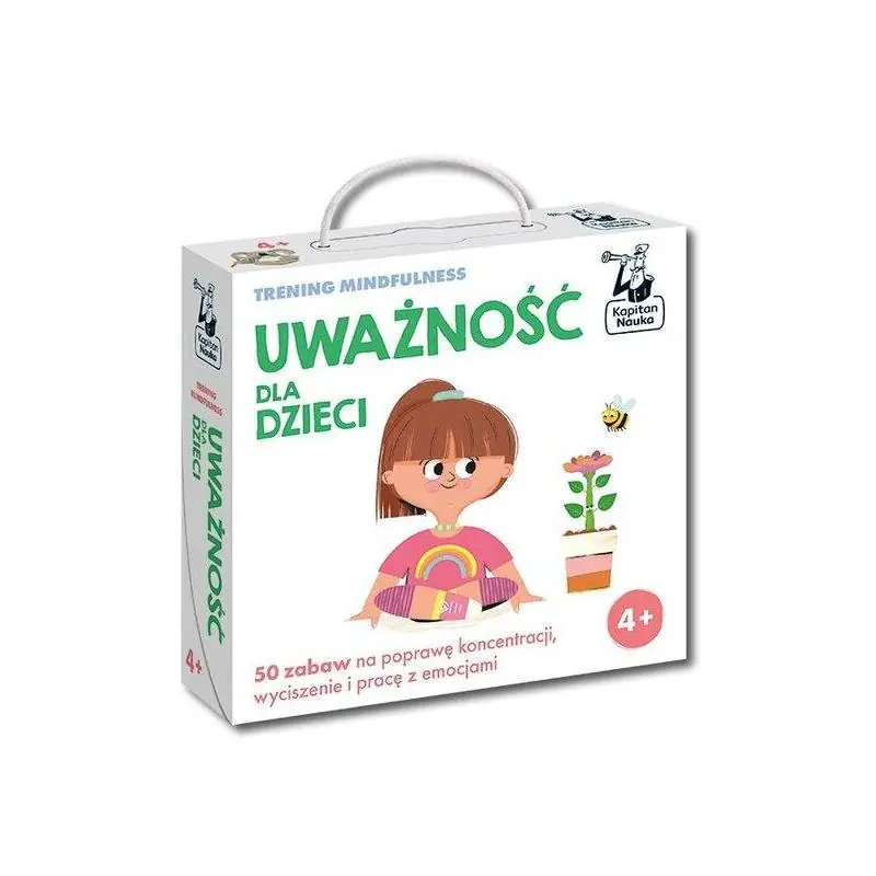 50 zabaw na poprawę koncentracji, wyciszenie i pracę z emocjami! Bądź skupiony jak jastrząb, przyjrzyj się chmurom i narysuj niepowtarzalny gwiazdozbiór wdzięczności! Ćwiczenia uważności pomagają w zrozumieniu siebie i otaczającego świata, redukują stres i poprawiają samopoczucie. Uważność dla dzieci to 50 pięknie ilustrowanych kart, które są wszechstronnym narzędziem do pielęgnowania w dzieciach wewnętrznego spokoju, asertywności i koncentracji. Dzięki różnym tematom i sposobom wykonywania ćwiczeń (zabawy ruchowe, ćwiczenia oddechowe, zabawy relaksacyjne, wizualizacje, aktywności plastyczne) karty mogą towarzyszyć dzieciom w różnych sytuacjach i o każdej porze dnia. Powstały z myślą o najmłodszych, jednak spodobają się niezależnie od wieku! Można z nich korzystać w domu, przedszkolu, szkole czy gabinecie psychologicznym. Zabawy z kartami wzmacniają w dziecku świadomość własnego ciała, a przez to uczą rozpoznawania emocji, pomagają ćwiczyć samoregulację, inteligencję emocjonalną i umiejętność skupienia się na tu i teraz. Wspierają także dziecko w budowaniu relacji opartych na wzajemności i dobrej komunikacji. W pełnym bodźców i codziennych wyzwań emocjonalnych świecie aktywności z kart mogą zapewnić wyciszenie, relaks i redukcję napięcia zarówno u dziecka, jak i u rodzica. Autorka Małgorzata Kulikowska to pedagog, certyfikowany trener uważności dla dzieci w ramach metod dr. Christophera Willarda oraz Eline Snel. Jej pracy nadaje kierunek pedagogika serca, ponieważ uważa, że wzajemna życzliwość i empatia są kluczowe w niesieniu pomocy innym. Kapitan Nauka to marka, która powstała dzięki rodzicom poszukującym mądrej, pełnej radości, ale i wymagającej rozrywki dla dzieci. Skupiamy się na zagadkach, grach, puzzlach i książeczkach, które uczą przez kreatywną zabawę i wspomagają rozwój dziecka. Produkty Kapitana Nauki dostosowane są do potrzeb dzieci od narodzin do 11. roku życia. Stymulują rozwój kluczowych umiejętności, takich jak koncentracja, pamięć, spostrzegawczość, myślenie logiczne, kreatywność. Są świetną alternatywą dla smartfona czy komputera, a czas spędzony przy wspólnych rozgrywkach, w gronie rodziny lub rówieśników wzmacnia więzi i umiejętności komunikacyjne.