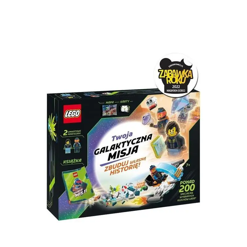 Zestaw z książką, klockami i minifigurkami LEGO®, MAPĄ ORAZ KARTAMI W zestawie: • księga misji, mapa galaktyki, dwie unikatowe minifigurki LEGO® i ponad 200 klocków LEGO, • 8 kart z dodatkowymi misjami, • nowe, niezwykłe podejście do konstruowania i przerabiania modeli LEGO bez instrukcji, • inspiracje i pomysły na tworzenie własnych,