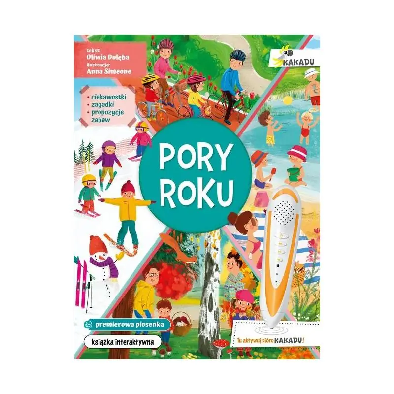 Pory roku to książka interaktywna z piórem Kakadu, które uruchamia zakodowane na stronach teksty i dźwięki. Publikacja jest częścią innowacyjnego systemu nauki i zabawy w jednym. Mały czytelnik oglądając piękne i pełne szczegółów ilustracje Anny Simeone, poznaje kolejne pory roku. Słucha ciekawych informacji, obserwuje budzącą się do
