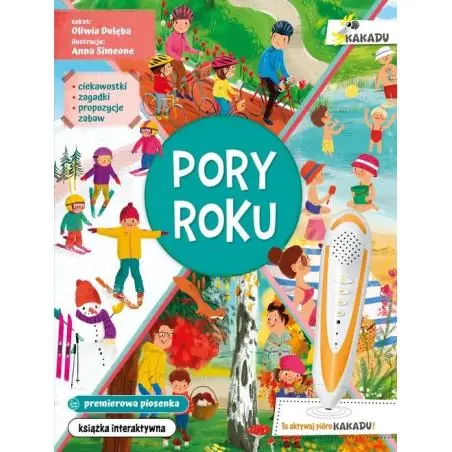 Pory roku to książka interaktywna z piórem Kakadu, które uruchamia zakodowane na stronach teksty i dźwięki. Publikacja jest częścią innowacyjnego systemu nauki i zabawy w jednym. Mały czytelnik oglądając piękne i pełne szczegółów ilustracje Anny Simeone, poznaje kolejne pory roku. Słucha ciekawych informacji, obserwuje budzącą się do życia przyrodę, słyszy głosy ptaków i szum rzeki, towarzyszy bohaterom na wakacjach, wyrusza z nimi na spacer do jesiennego lasu, uczestniczy w przygotowaniach do świąt i słucha kolędy. Dzięki odkrywaniu nazw poszczególnych elementów ilustracji i słuchaniu tekstów dziecko rozwija mowę i wzbogaca słownictwo. Co więcej, na każdej stronie może sprawdzić swoją pamięć i spostrzegawczość, odpowiadając na pytania. Książka zawiera również ciekawostki i instrukcje kreatywnych zabaw. Wyjątkową atrakcją jest premierowa piosenka z podkładem muzycznym, którą dziecko może śpiewać samo lub z pomocą dorosłego. Na uwagę zasługuje świetna oprawa lektorska. Pozostałe tytuły książek Kakadu : Widzę, słyszę, poznaję. Zwierzęta domowe Widzę, słyszę, poznaję. Zwierzęta świata Angielski słowniczek obrazkowy