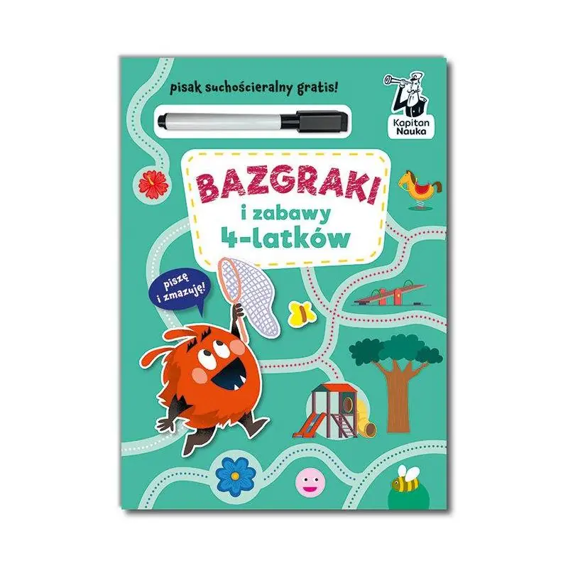 Bazgraki i zabawy 4-latków Rozwijające zabawy z pisakiem suchościeralnym! Czym różnią się rysunki? Które sprzęty na placu zabaw wybrały Bazgraki? Co wyjdzie z połączenia kropek? Bazgraki i zabawy dla 4-latków to rozwijające łamigłówki, dzięki którym przedszkolaki trenują myślenie logiczne, umiejętność segregowania i układania sekwencji oraz ćwiczą rękę, rysując po śladzie i przechodząc labirynty. Różnorodne zadania przygotowują do nauki pisania, rozwijają koncentrację i spostrzegawczość, a także ćwiczą pamięć wzrokową i orientację w przestrzeni. Oryginalne i zabawne ilustracje oswajają przedszkolaki z nowymi miejscami, takimi jak przedszkole, dom, park, biblioteka czy sklep, lub przypominają o dobrze znanym otoczeniu. Dzięki dołączonemu do książki flamastrowi suchościeralnemu odpowiedzi można zmazywać i poprawiać bez końca, a wygodny, duży format A4 pozwala na swobodne rysowanie i bazgranie. Rysuj, ścieraj i baw się z Bazgrakami!