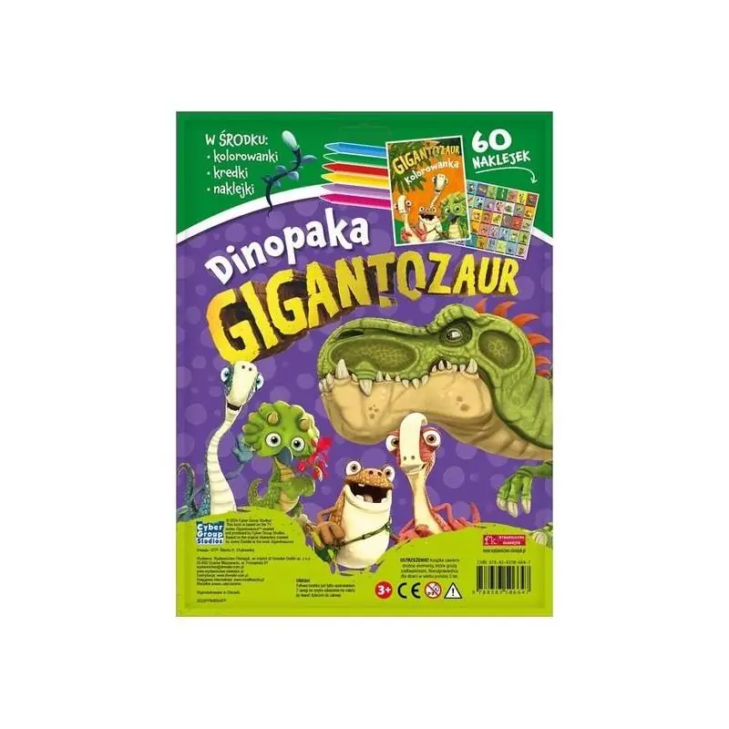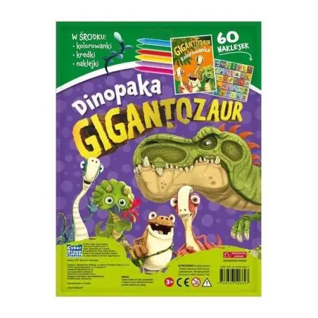 Idealny zestaw na podróż! Kolorowanka z dinozaurami znanymi z animacji „Gigantozaur”, kredki oraz arkusz z naklejkami zapakowane w foliową kopertę z zapięciem strunowym. Koloruj dinki i ozdabiaj strony, jak tylko zechcesz. W „Dinopace” znajduje się kilkadziesiąt prostokątnych naklejek.